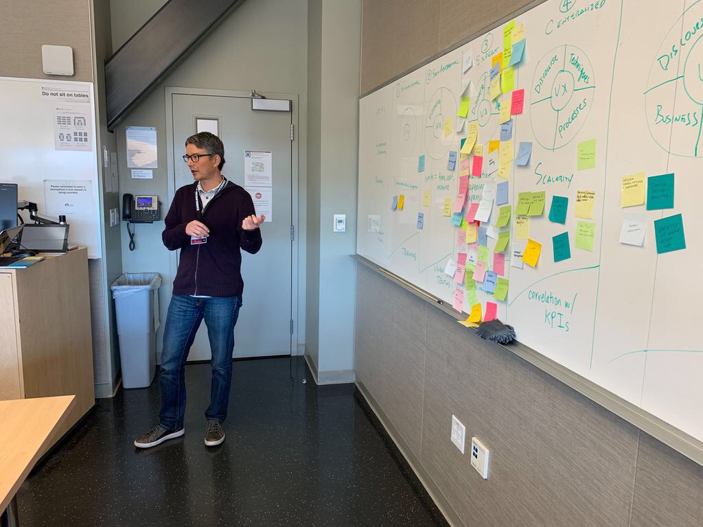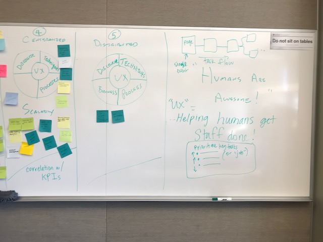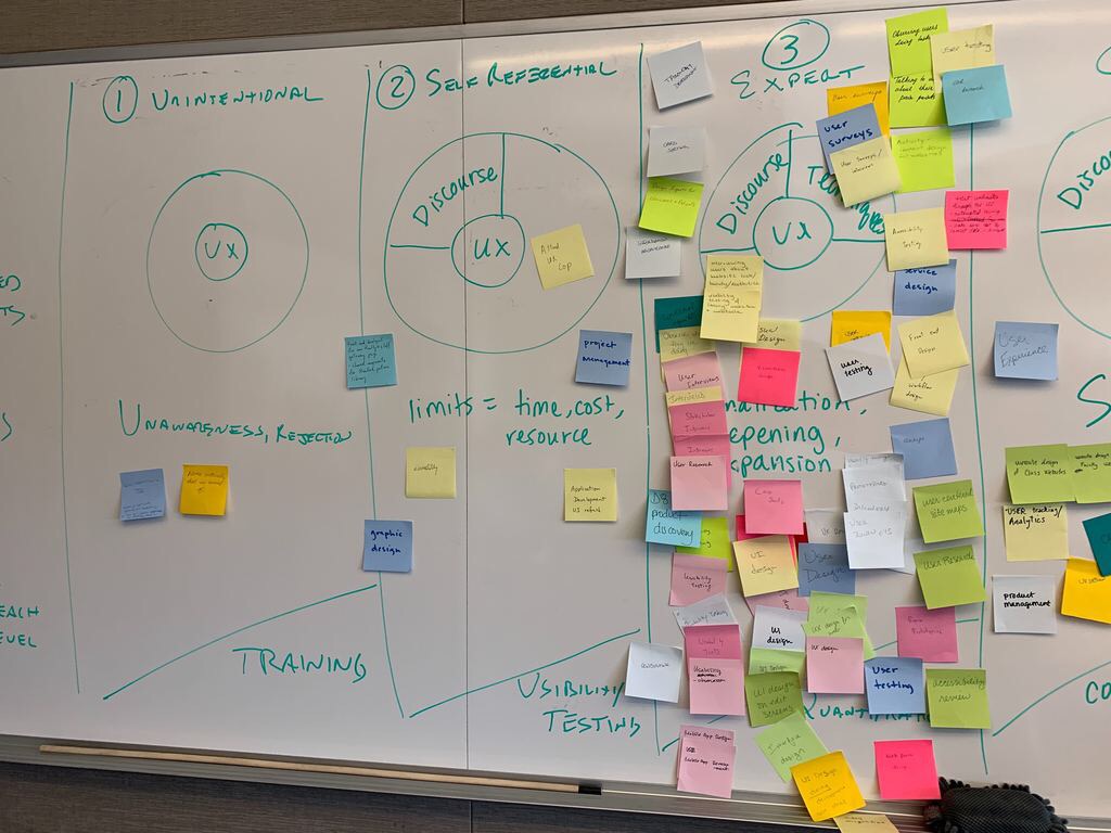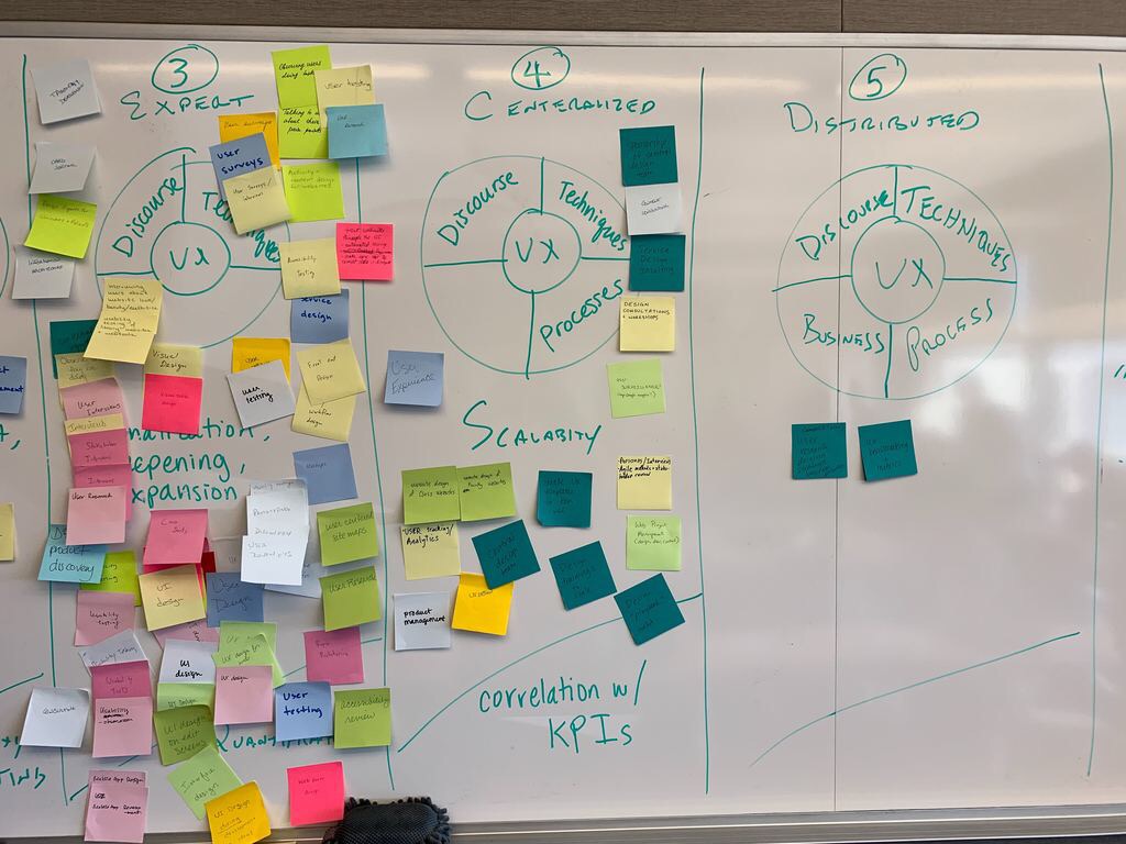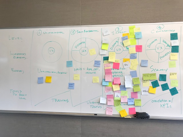 A way to move forward as a UX team - UX maturation path (levels: unintentional (formal and informal training), self referential (usability testing), expert (quantitative), centralized (correlation w/KPIs, distributed). Majority of UX work represented in the room fall into Expert level right now. We need to embed UX process into projects throughout organization even though we don't work on those projects. Data driven UX research will potentially influence the leadership decisions. We had a long discussion about usability testing and tools. Do incremental testing and fix things before you move on.